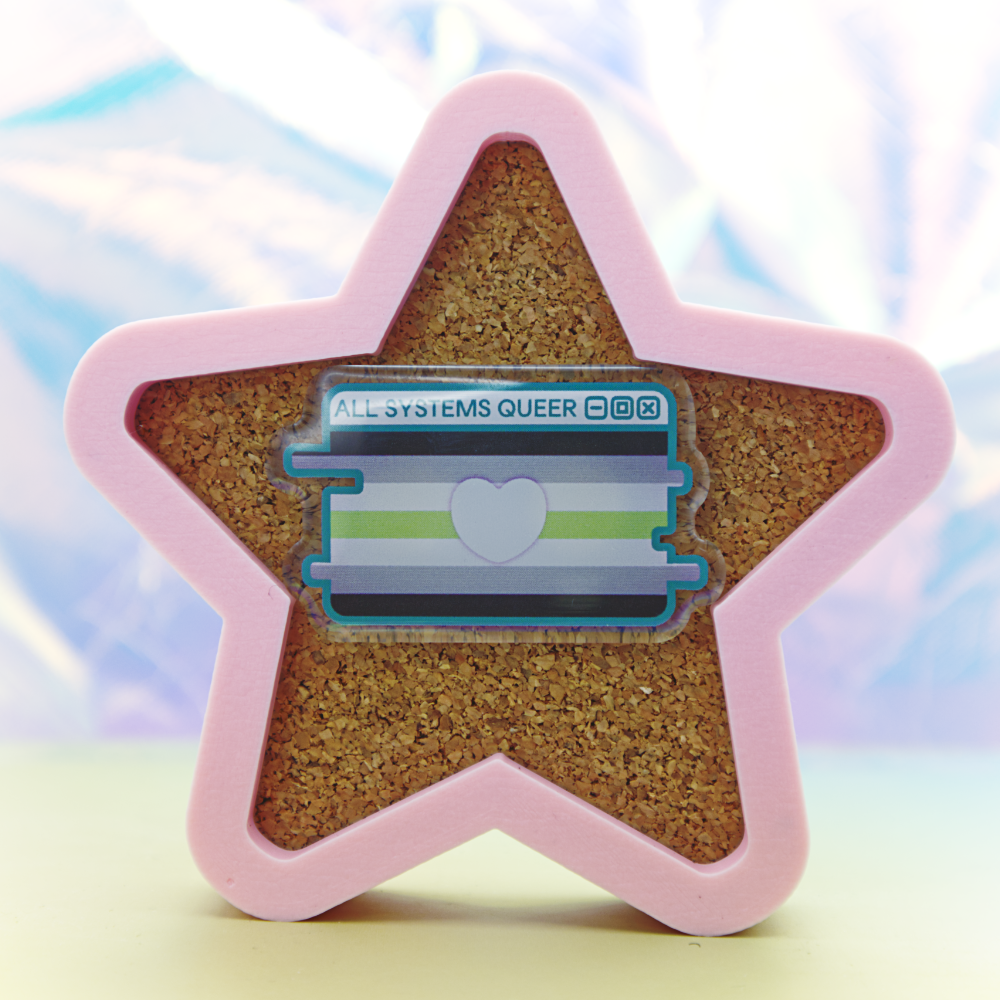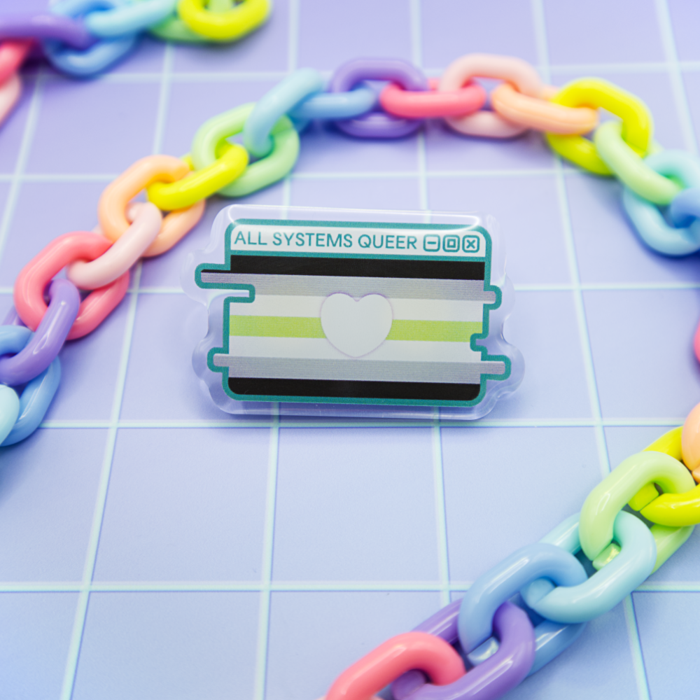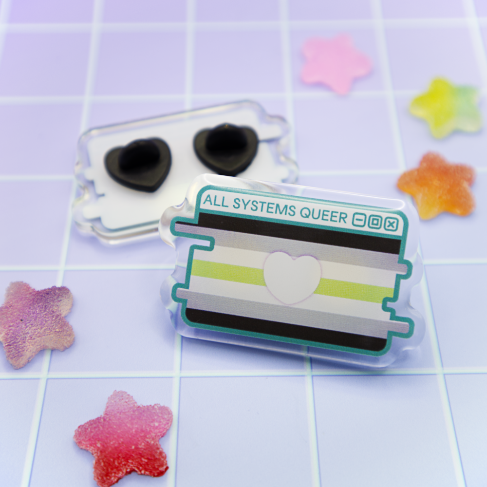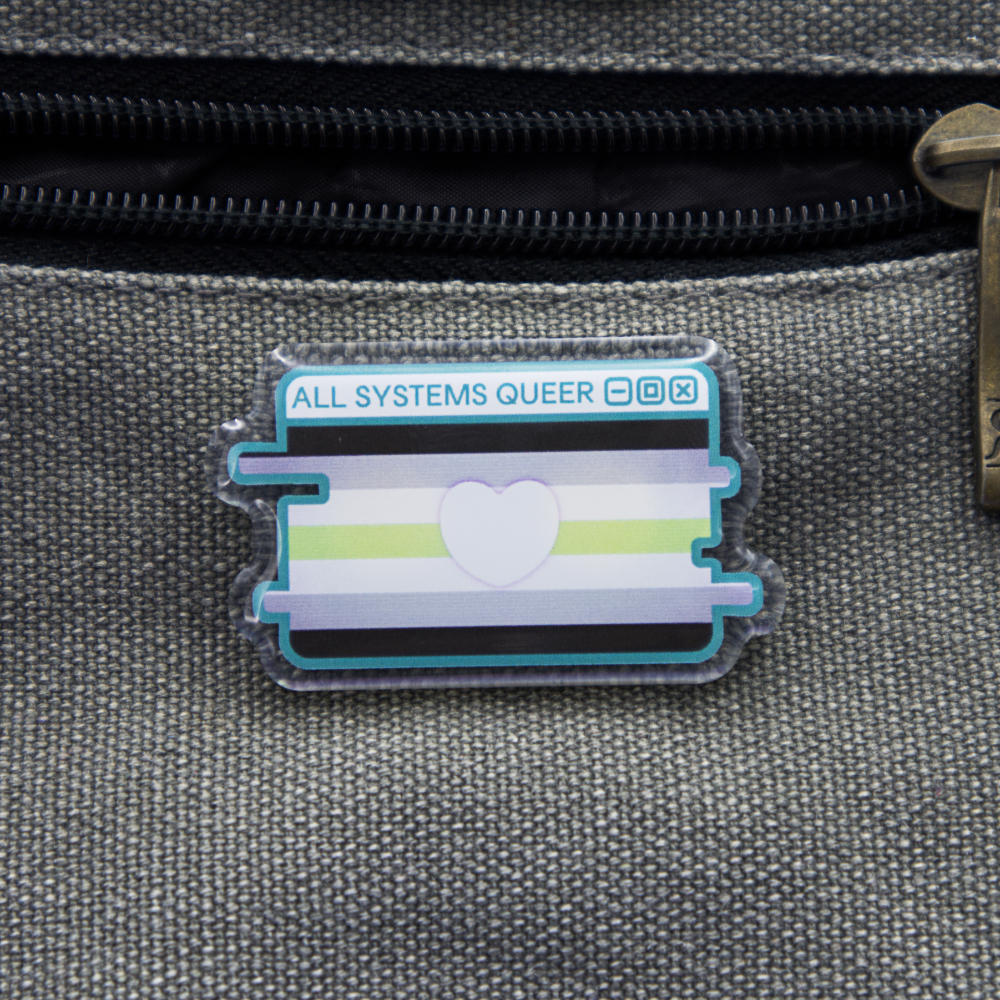 Show your colors with our "All Systems Queer" Agender Pride Pin, featuring an agender pride flag within a computer window motif. With two pin-back posts with heart-shaped rubber backings, these 2-inch pins are perfect for pinning on your pin bag or display banner, or wearing to let others know your pronouns.