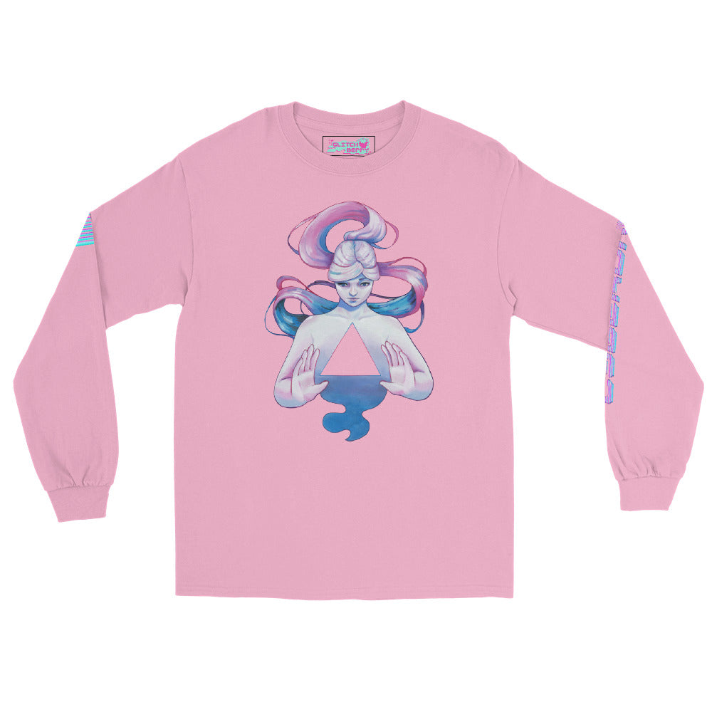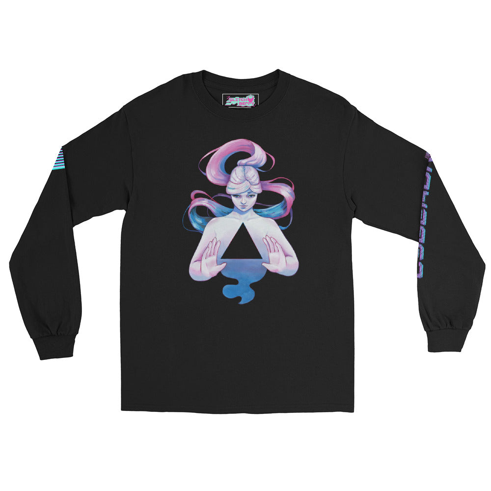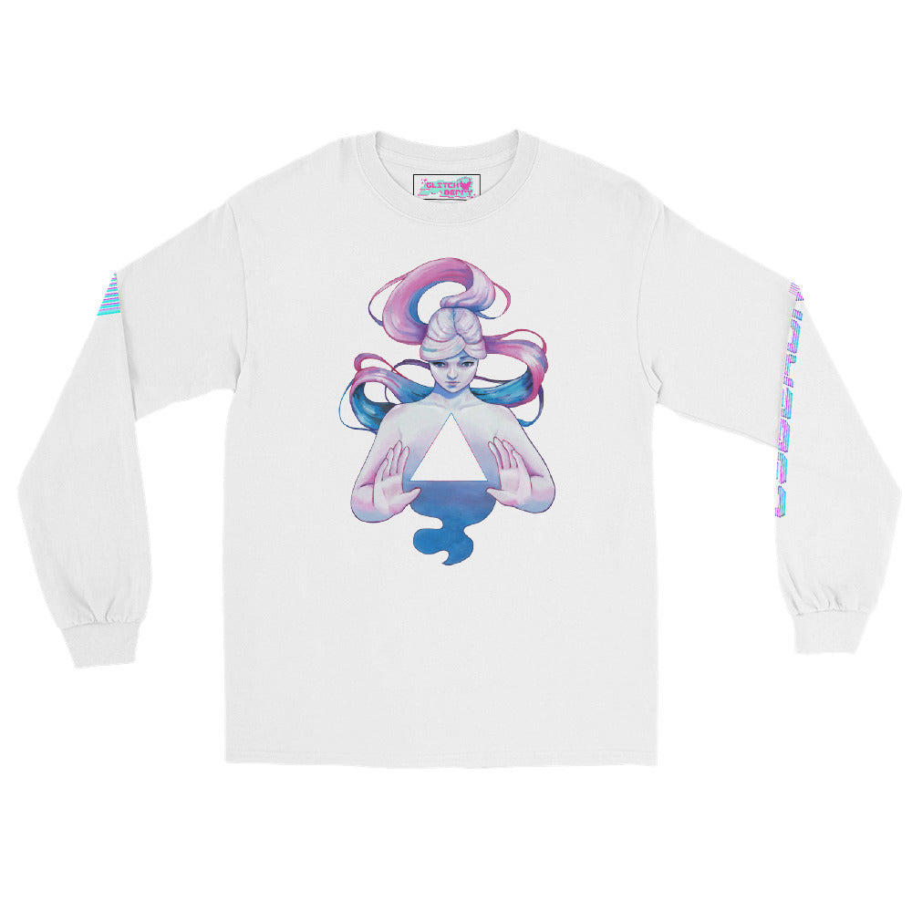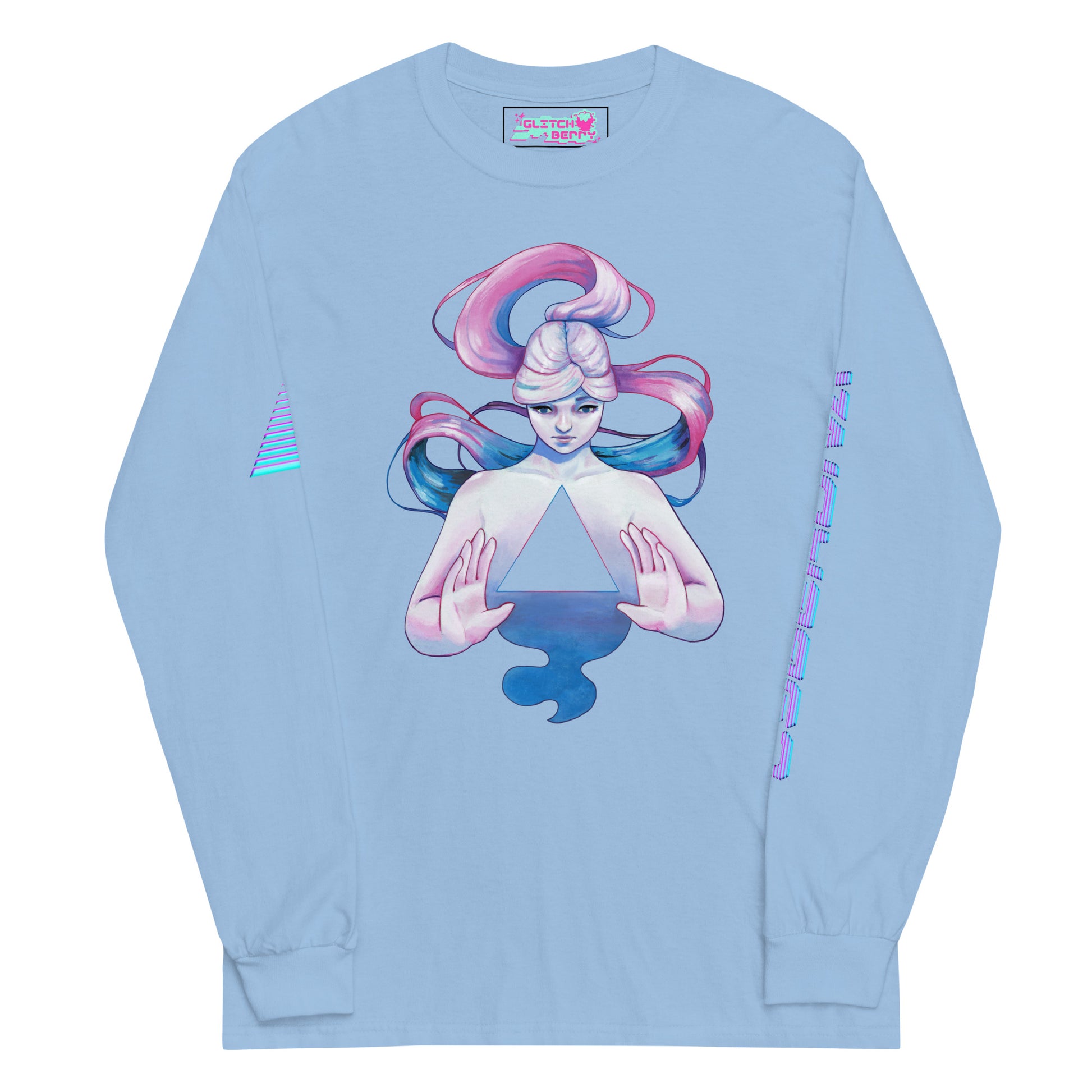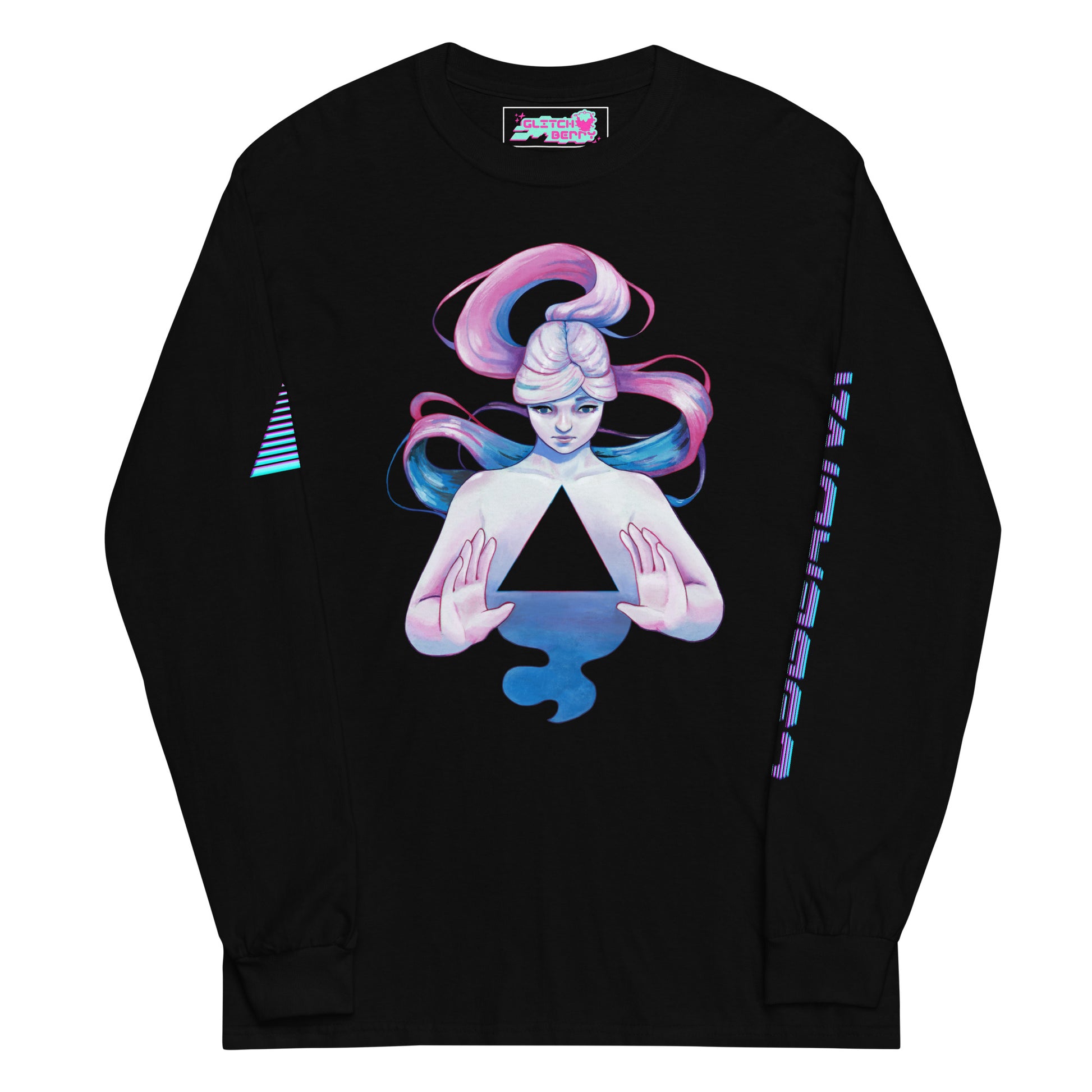 This unisex long-sleeved shirt features a surreal statuesque portrait with printed sleeve details. It has comfy long sleeves to protect you from the elements, cuffed at the wrist for a tapered look. This t-shirt will add a glitchy flair to your outfit.