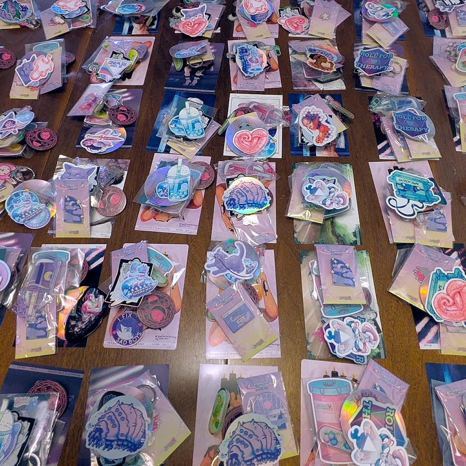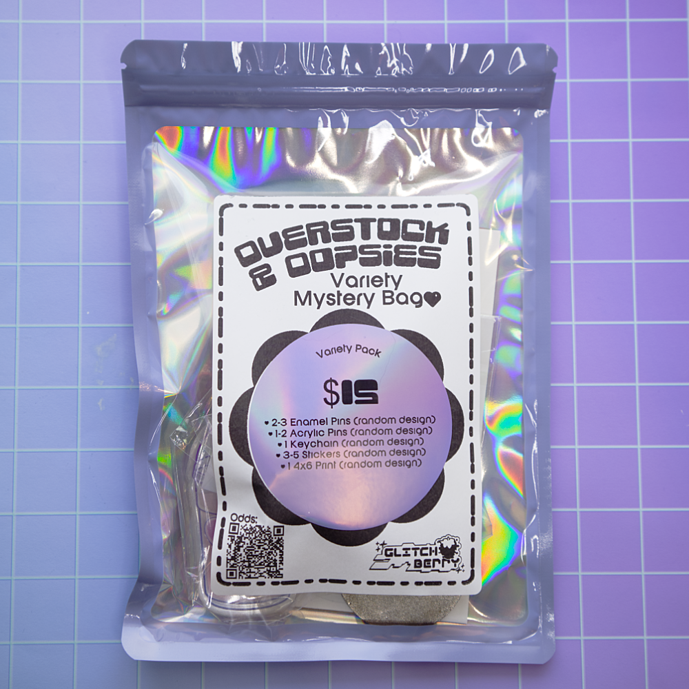 These mystery bags are perfect for someone who wants a small taste of GlitchBerry art at a low cost. Pick either Standard or Stationery variety to receive 2-3 Enamel Pins (random design), 1-2 Acrylic Pins (random design), 1 Keychain (random design), 3-5 Stickers (random design), and either a 4x6 mini print (Standard bag), OR a 5x8 notepad and 3x3 sticky note (Stationery Bag). Sample a variety of products with these Overstock and Oopsie bags, great for deal hunters or to stock up on quick gifts or stocking stuffers.
