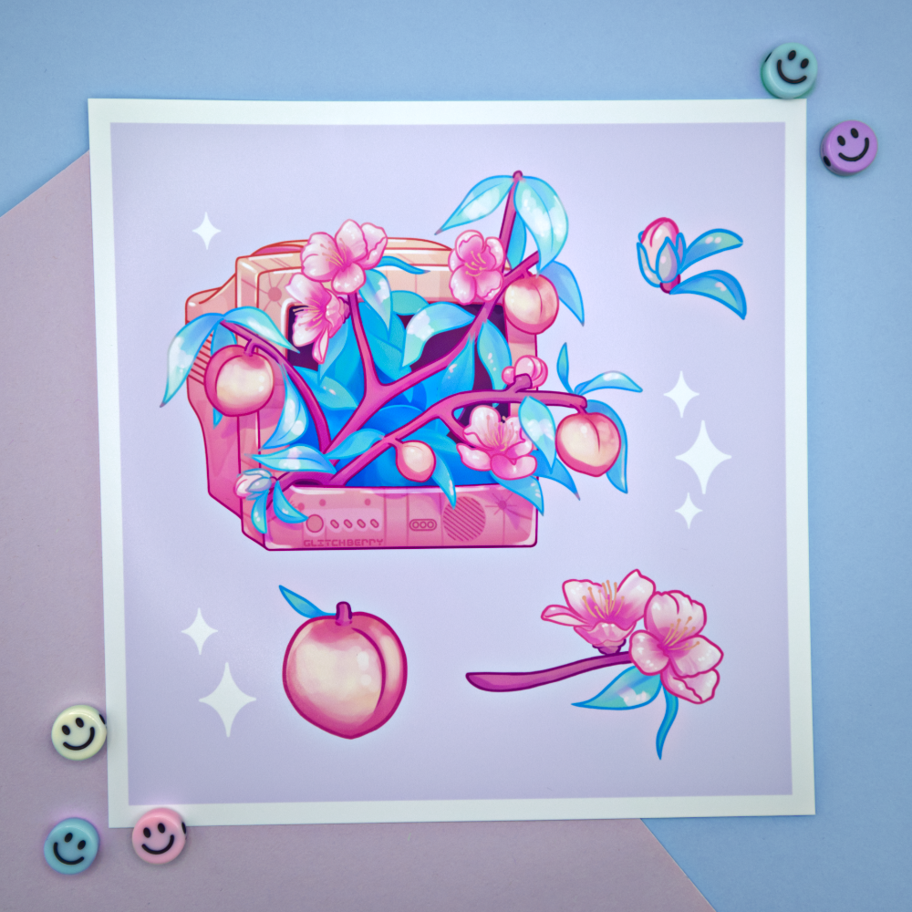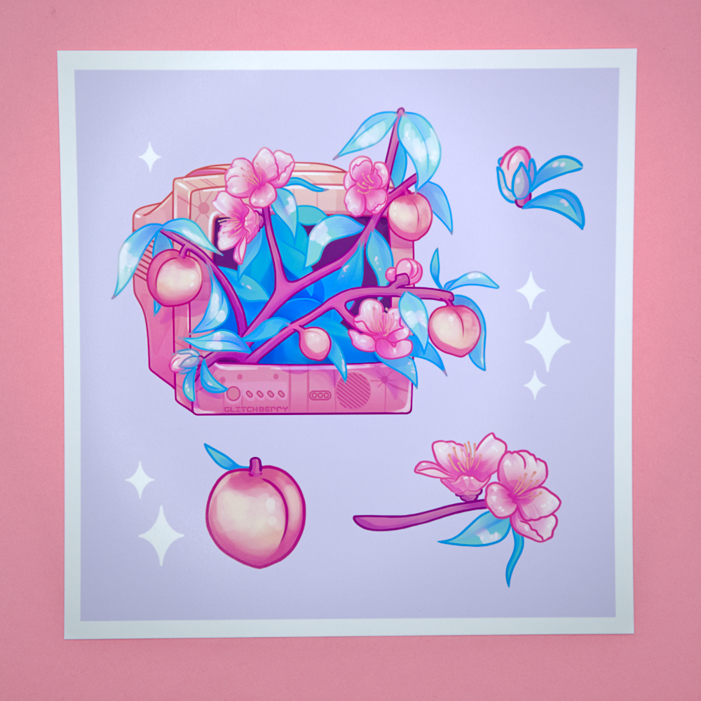 Express your love for retro technology with our Strawberry Cassette art print. Featuring a cute and colorful design based on a retro translucent TV mixed with a lovely peach tree, this 8-inch square kawaii wall art will add a pop of color to your home, office, gaming space, or wherever you wish to hang it.