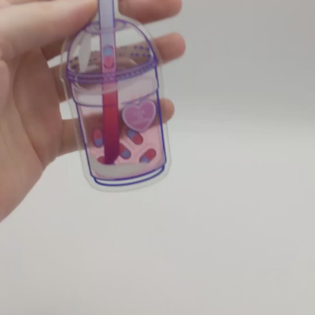 With a hot pink clasp to attach to your bag, wallet, or anything else you desire, this double-sided keychain contains a hollow cavity with five shakeable pill pieces to rattle around for fun and stimmy sounds.