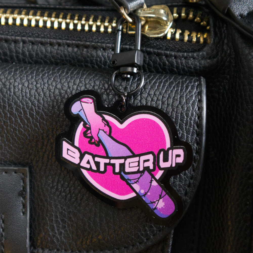 This bold statement keychain wants to warn anyone who gets too close that she'll knock you right out. Of the park, I mean. Featuring a Y2K-styled hand holding a barbed-wire bat with a heart in the background, this single-sided 2" keychain is printed on black acrylic. A sleek black clasp will attach this keychain to anything your heart desires.