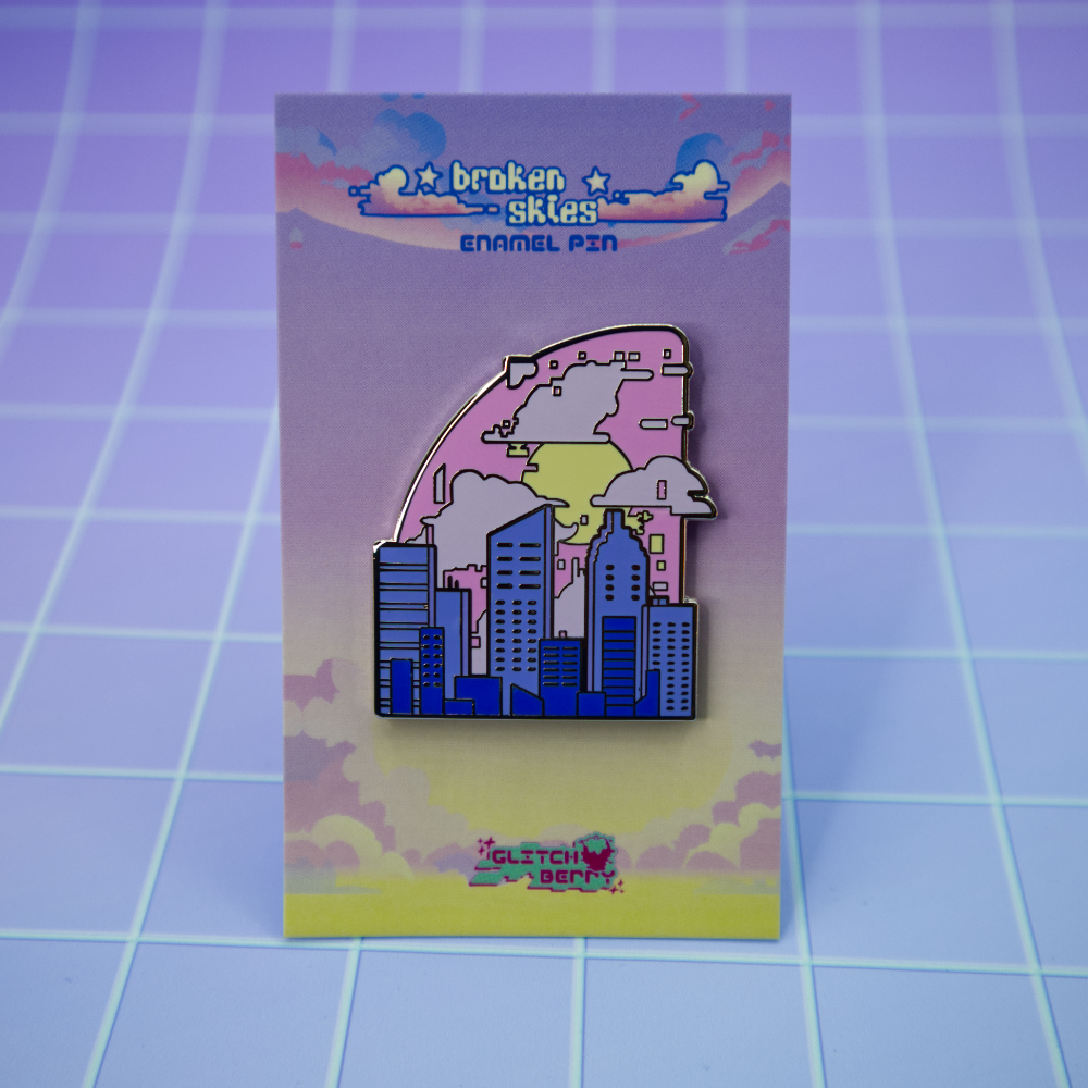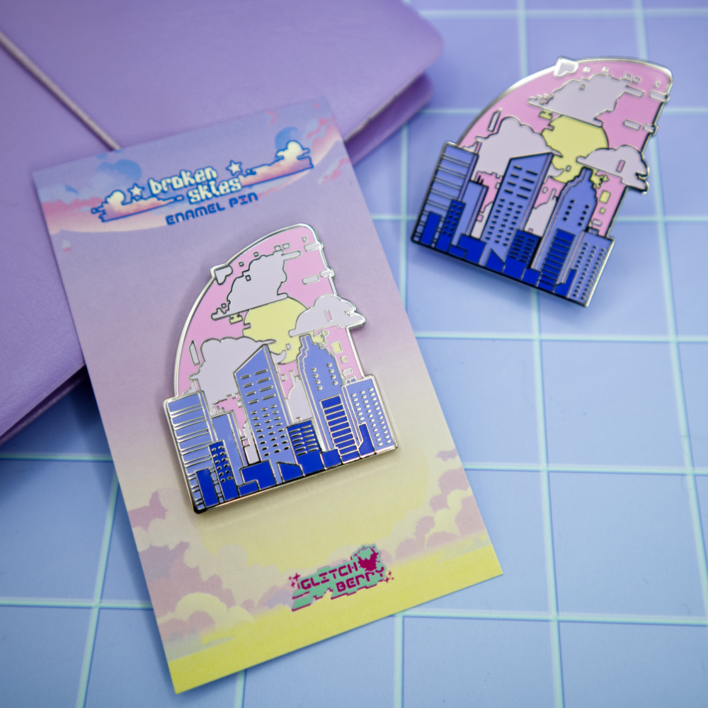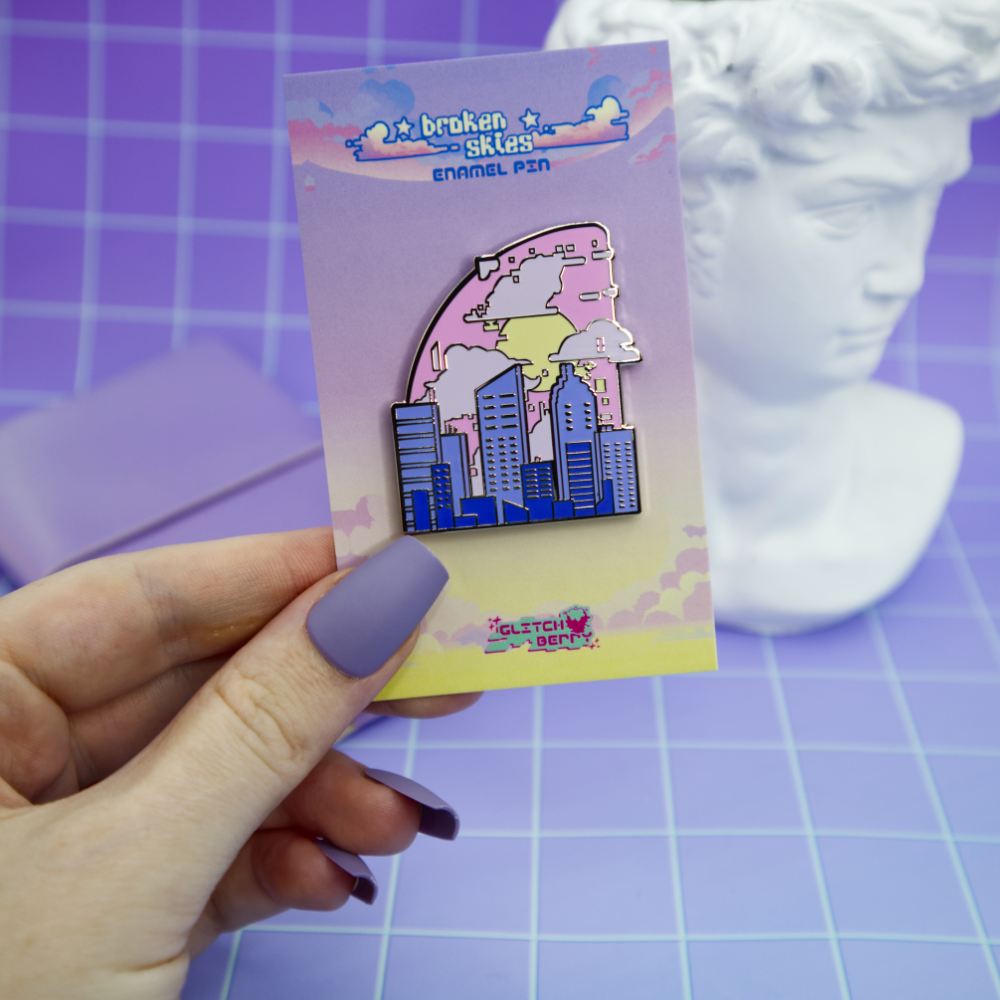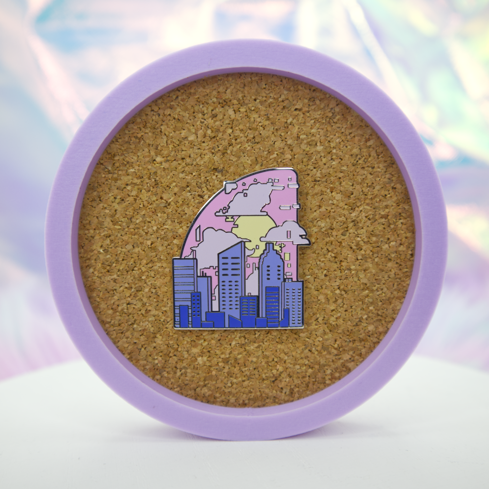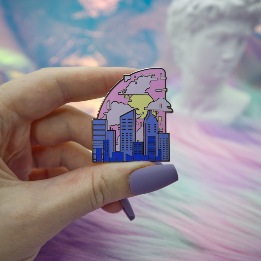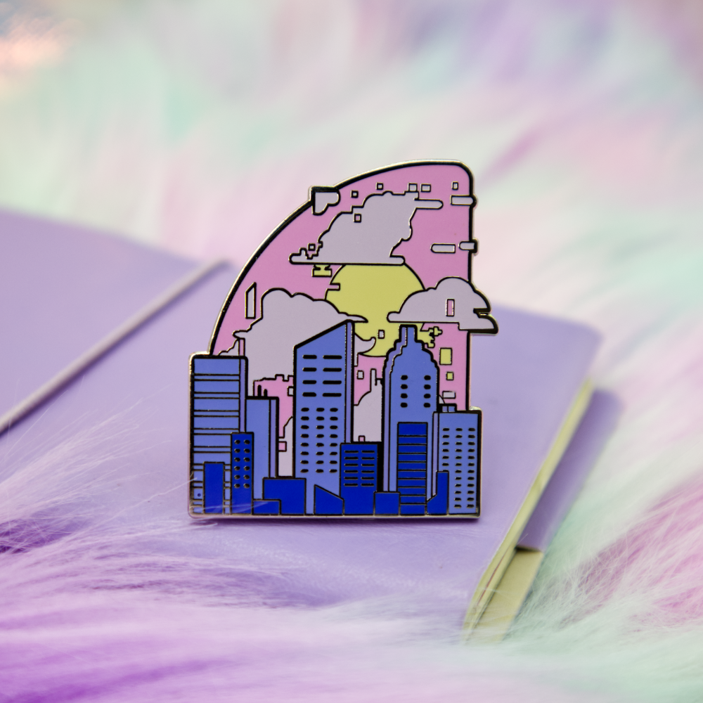 This pin, measuring in at 2", features a city skyline with its high-rises, backed by a glitchy sunrise. It's the perfect statement pin for your ita bag or pin display board.