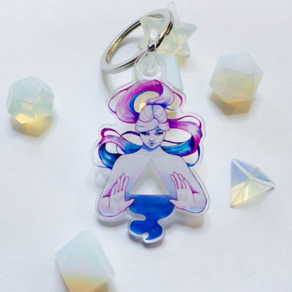 This 1" by 2" acrylic keychain is printed with the "Cyberdiva" design, with transparent areas in the hair and triangle window. Comes with a metal keyring attached.