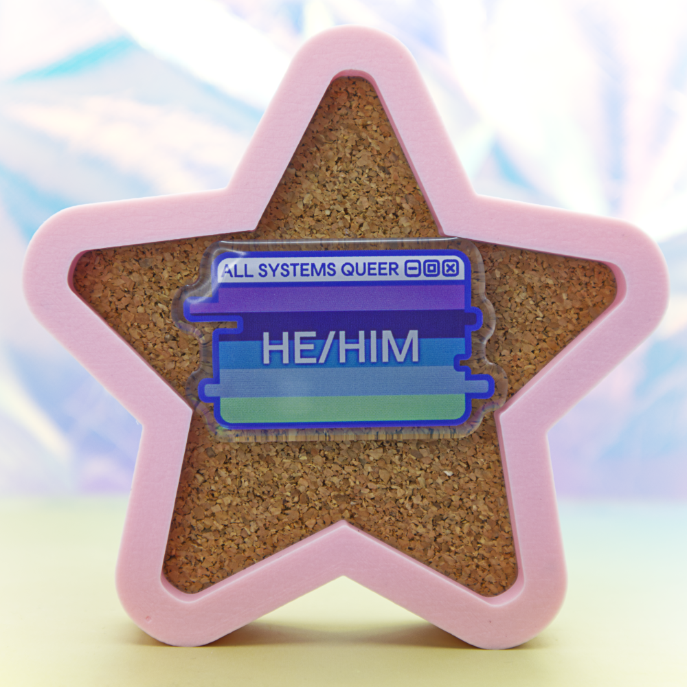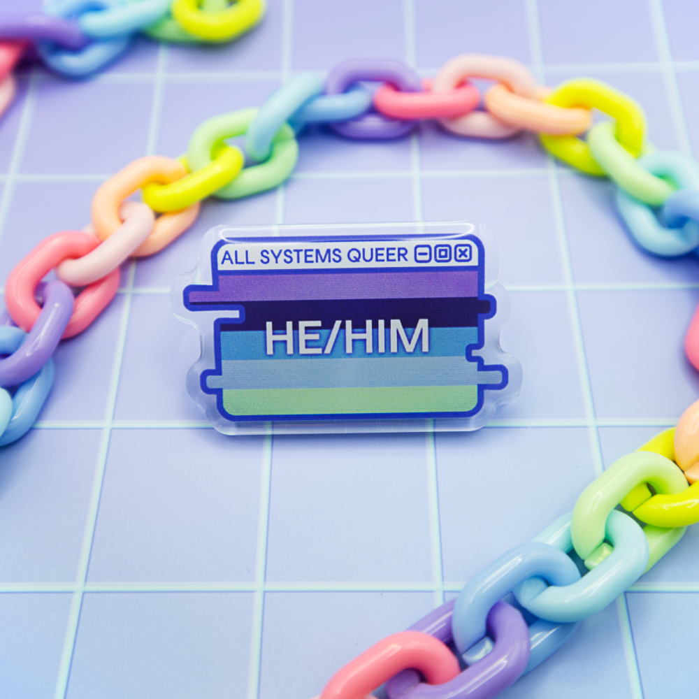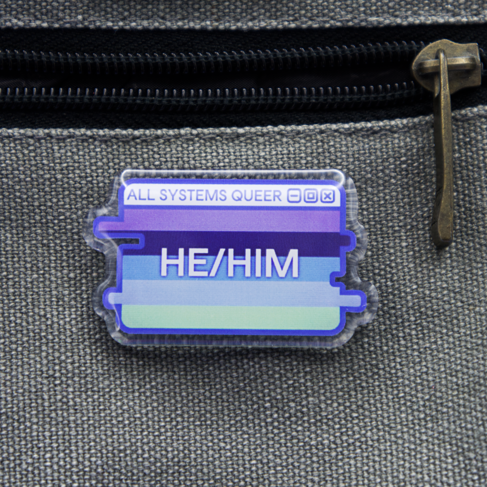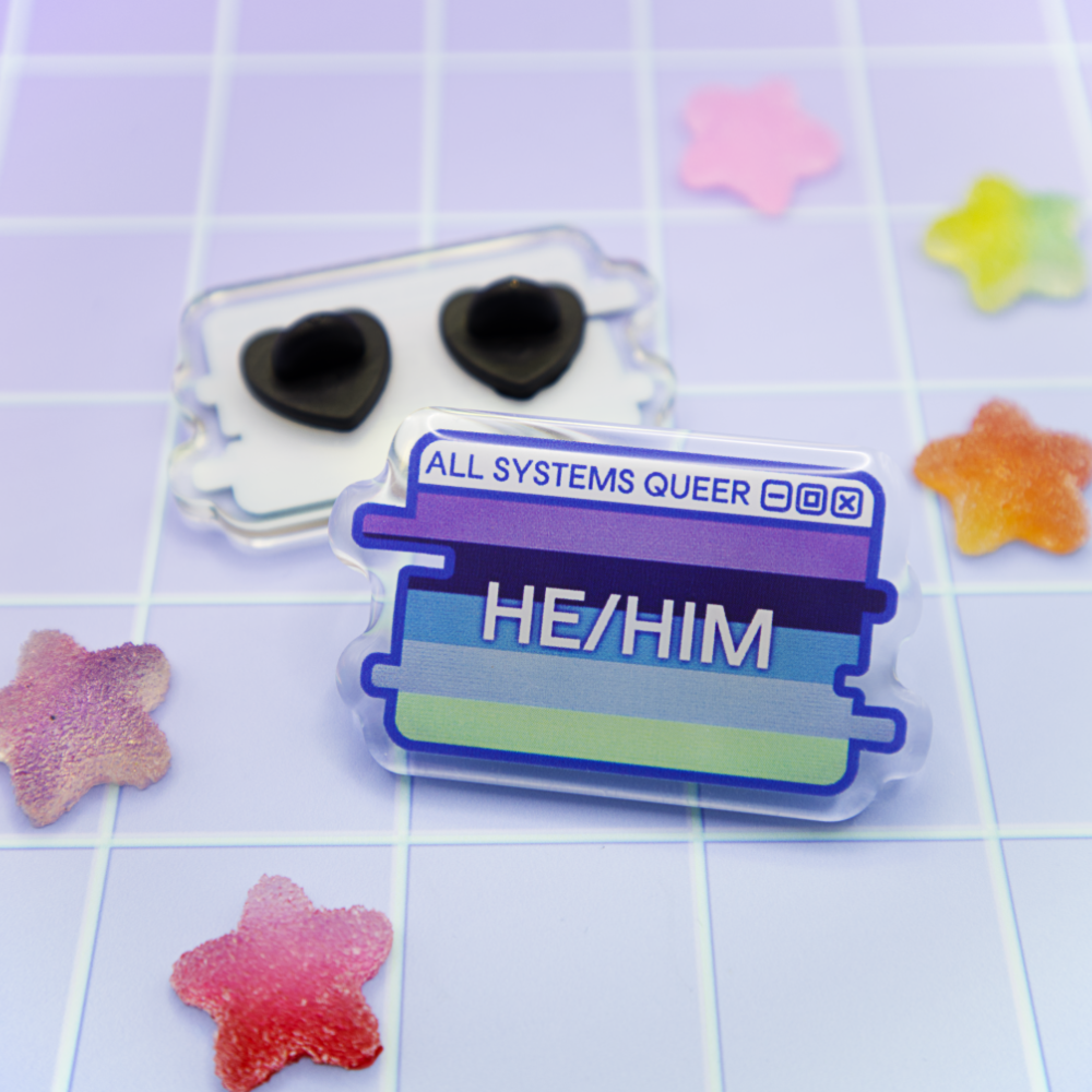 Show your colors with our "All Systems Queer" Pronoun Pin, featuring a He/Him Pronouns pride flag within a computer window motif. With two pin-back posts with heart-shaped rubber backings, these 2-inch pins are perfect for pinning on your pin bag or display banner, or wearing to let others know your pronouns.