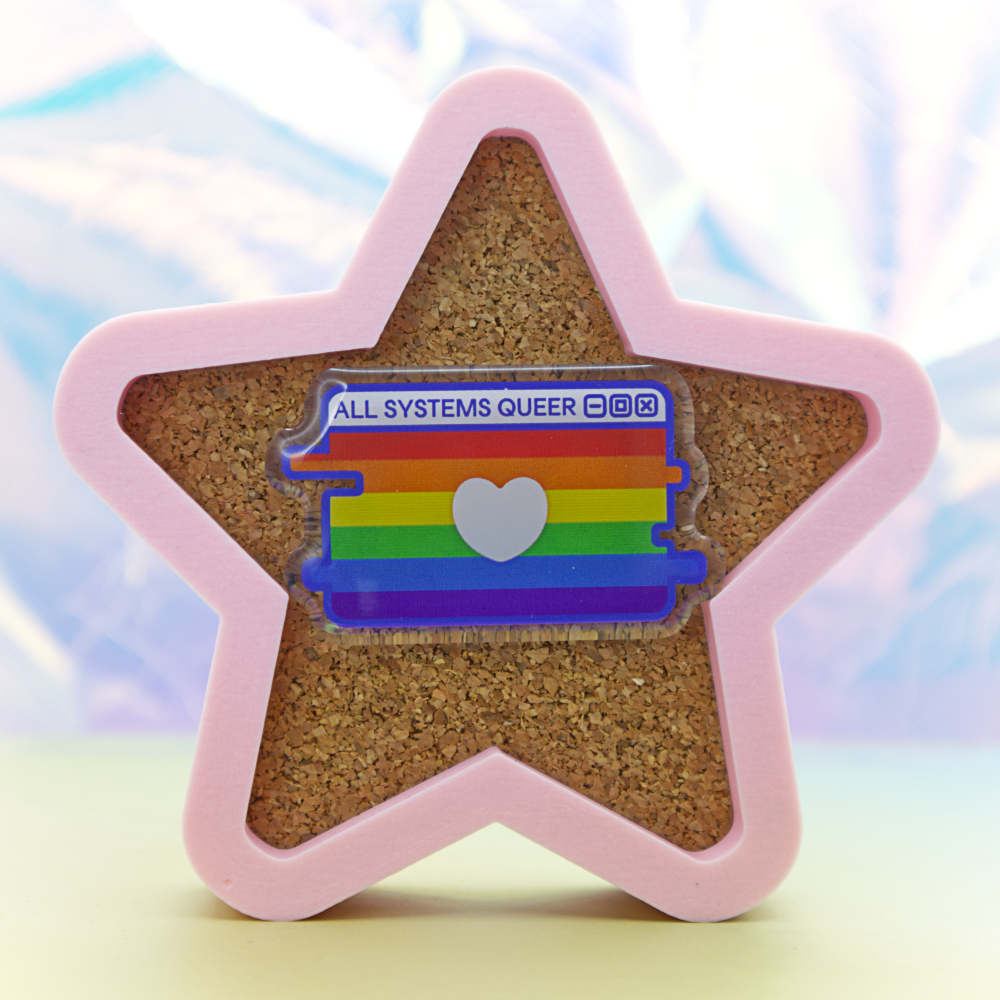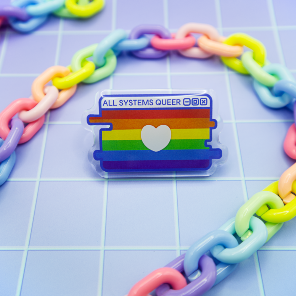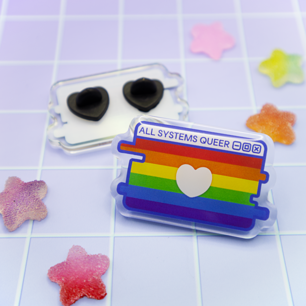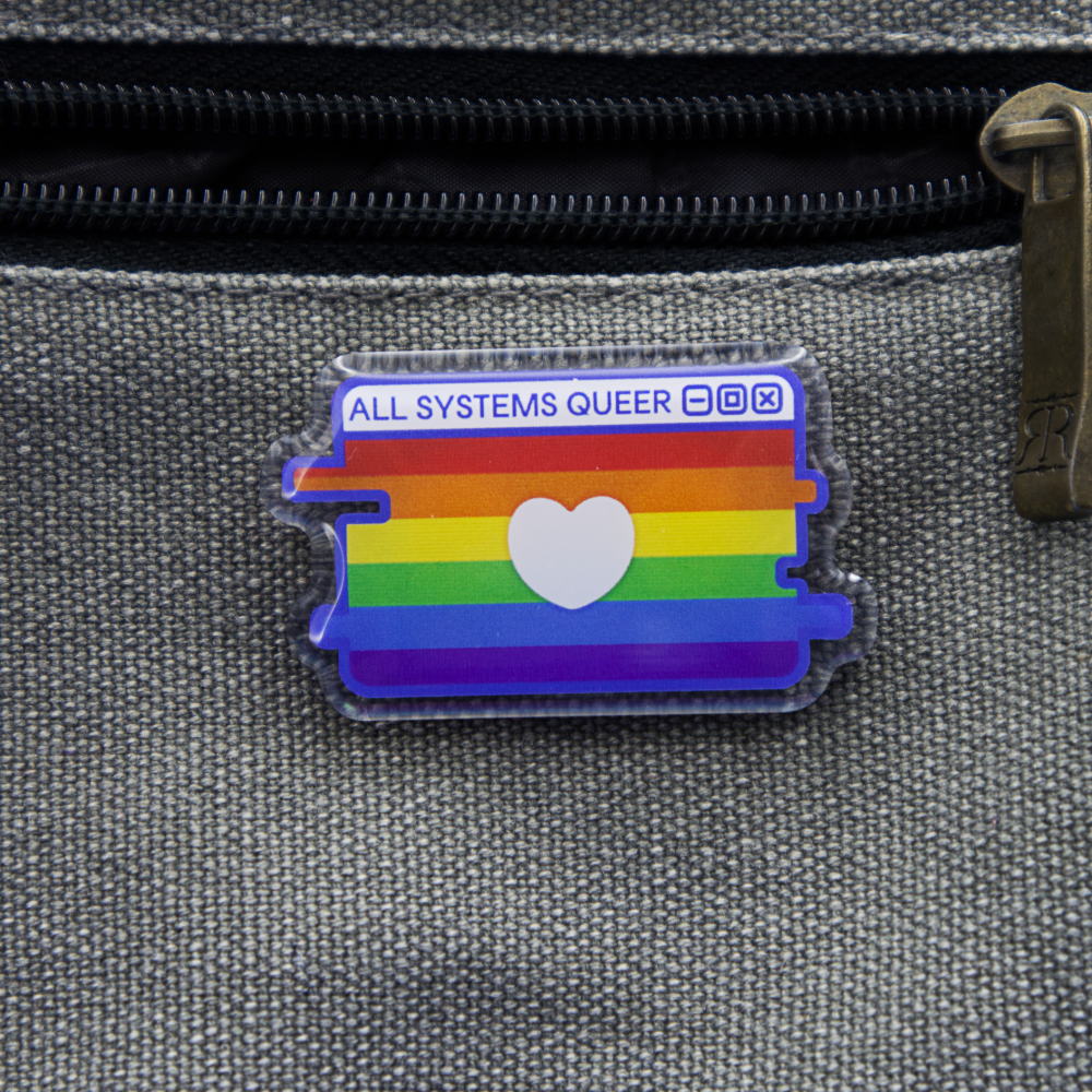 Show your colors with our "All Systems Queer" Pride Flag Pin, featuring a pride flag within a computer window motif. With two pin-back posts with heart-shaped rubber backings, these 2-inch pins are perfect for pinning on your pin bag or display banner.