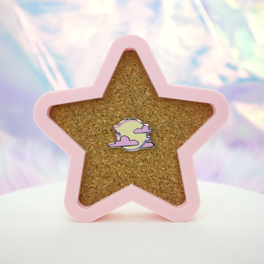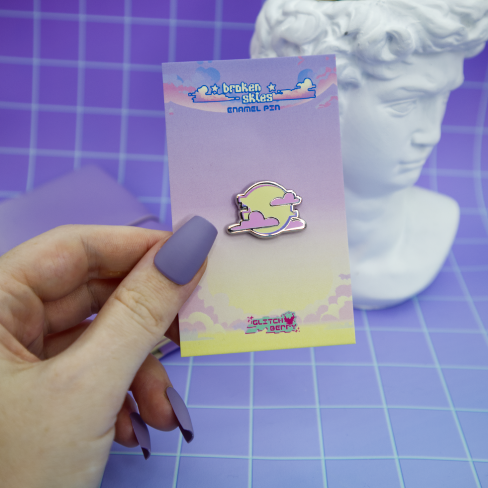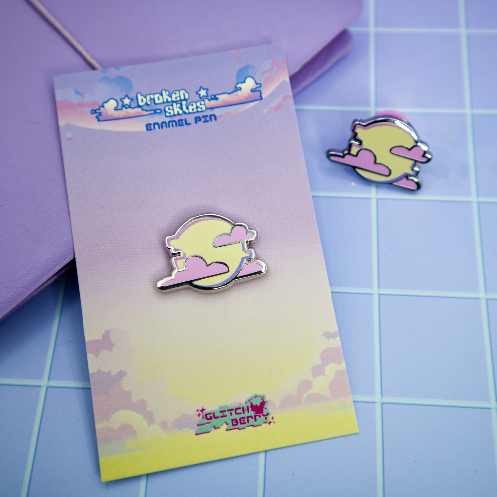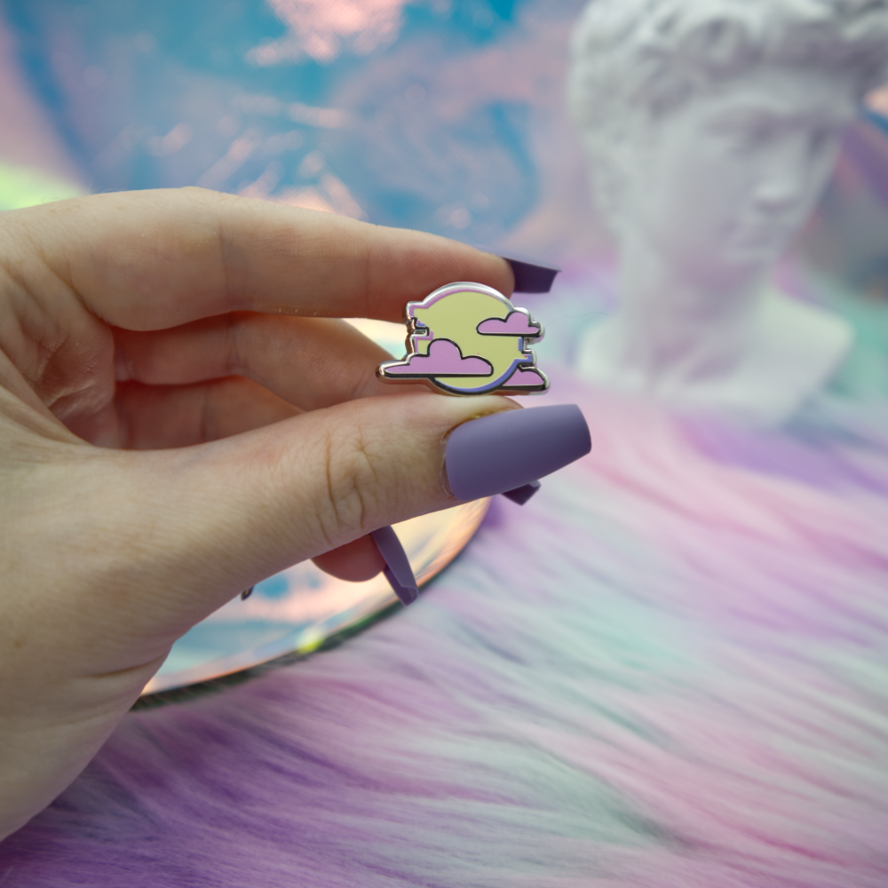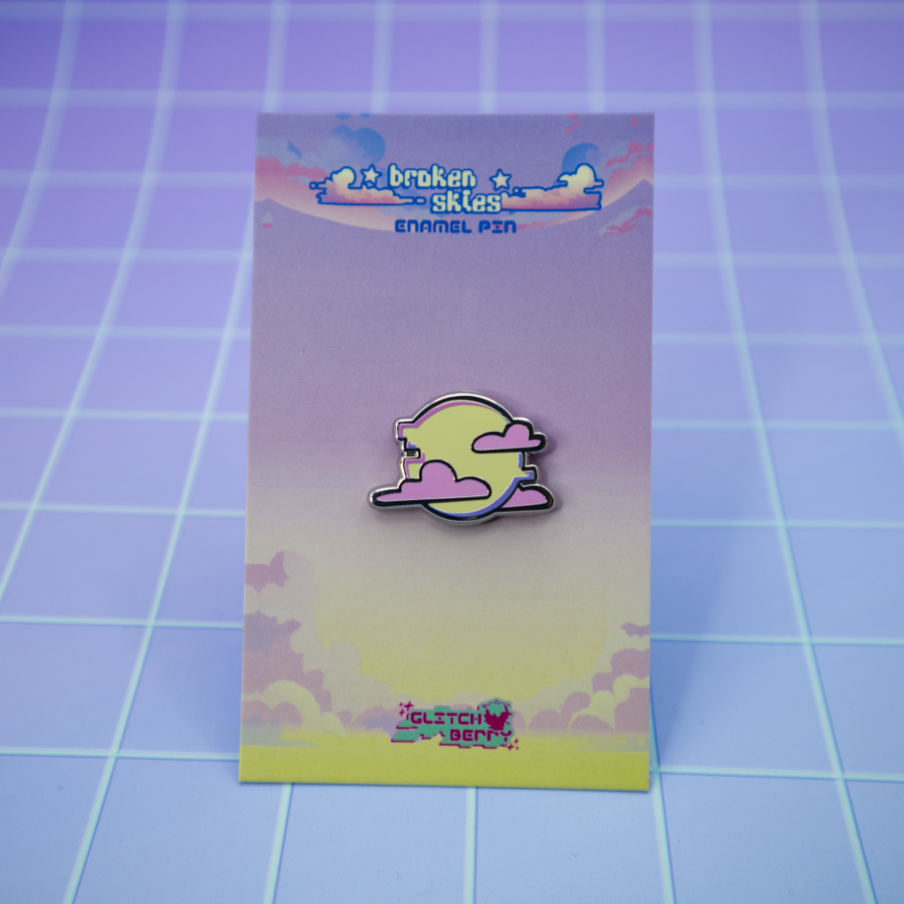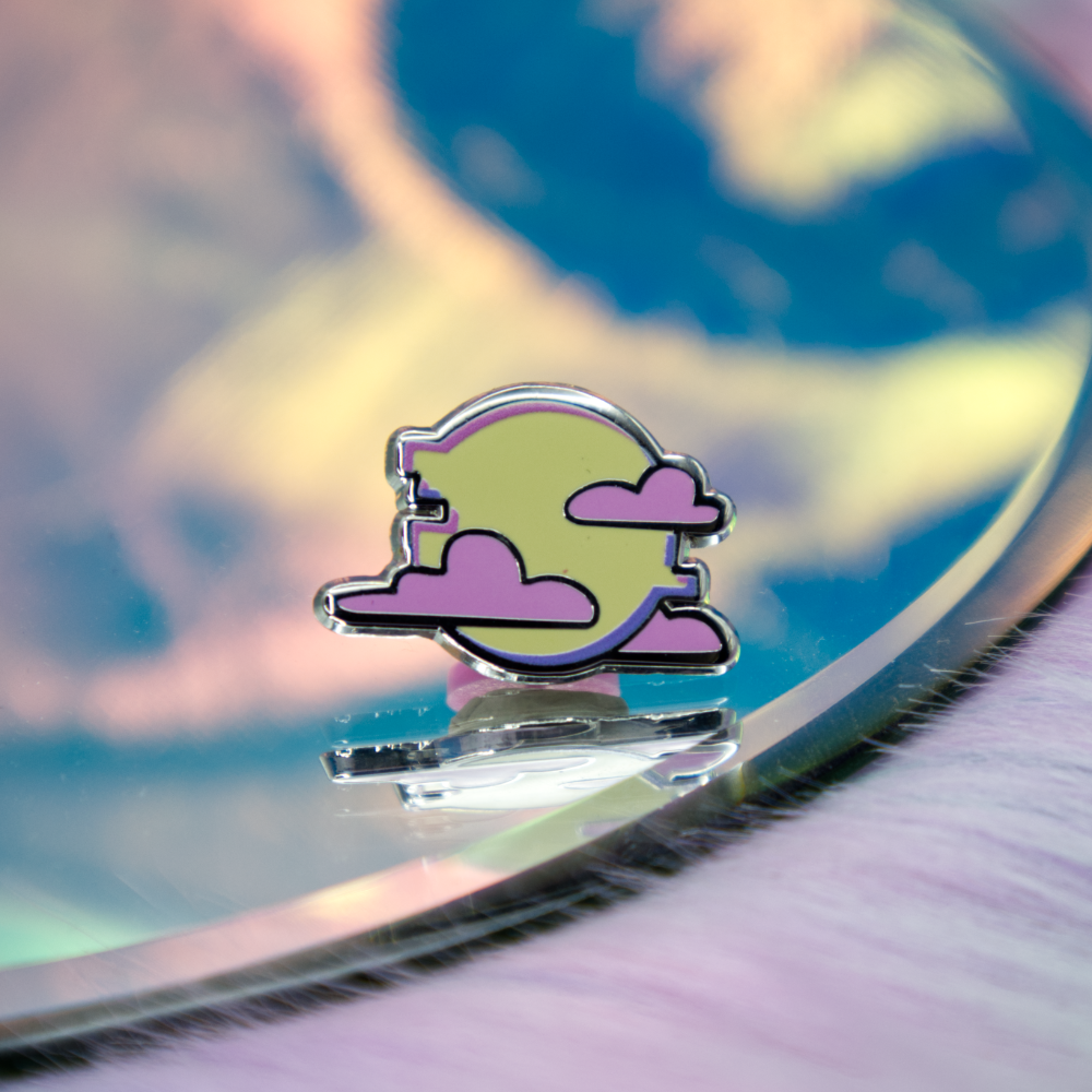 This pin, measuring in at 1", features a glitch sun and clouds with screen printed chromatic aberration detail. It's the perfect accessory for your ita bag or pin display board.